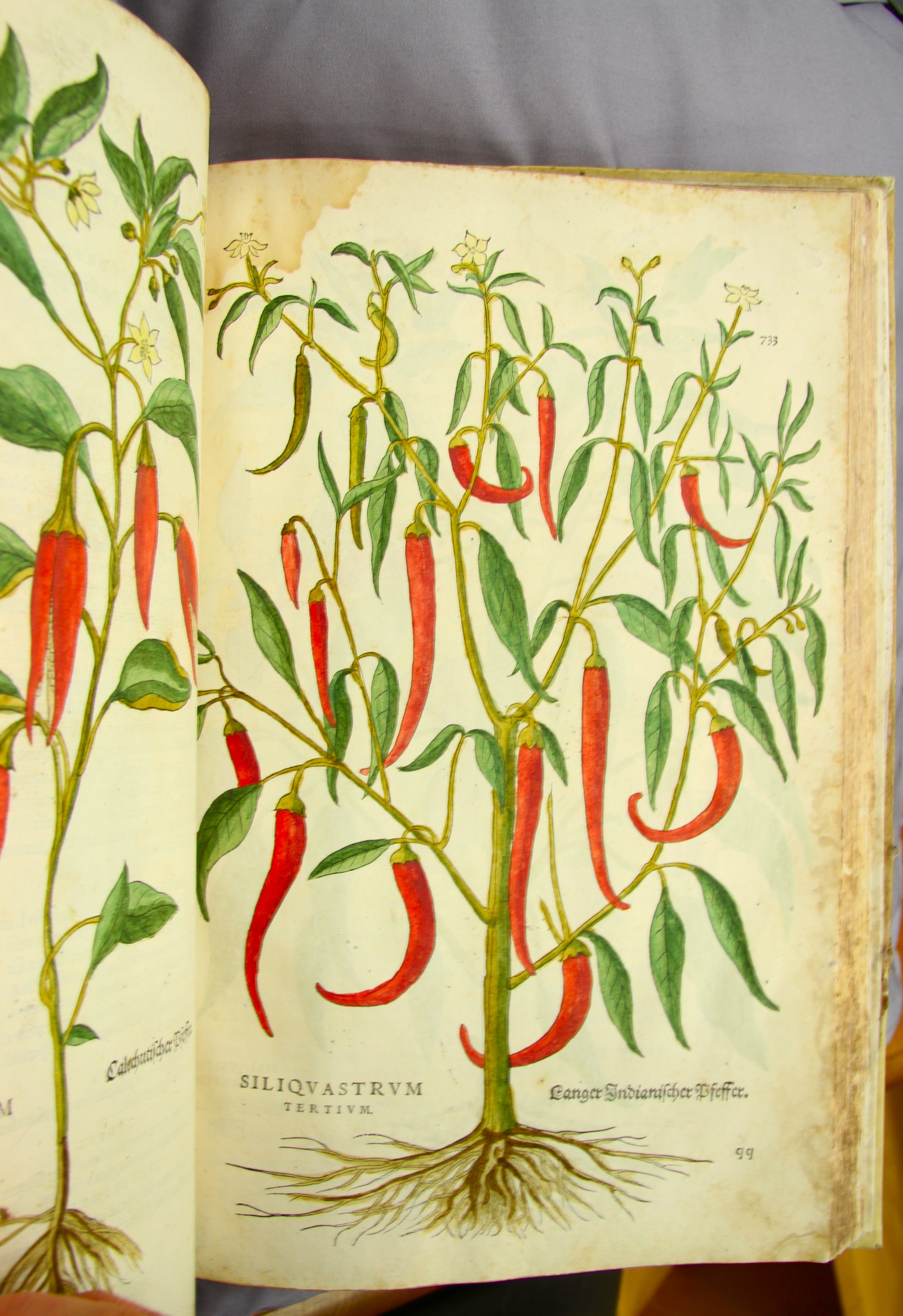 The librarian, Mrs Neus Verger, told us that the paper that was produced in the sixteenth and seventeenth centuries for early printed books was of much better quality than that which followed in the eighteenth, nineteenth and twentieth centuries, with the result that priority for conservation work often has to be given to ‘younger’ books. She made her point by showing us some holes created by insects in some of the pages of the botanical book. The insects had bored through the paper completely, but these small pinprick holes constituted the only damage: the surrounding paper was completely untouched. The insect depredations had caused no further decay.