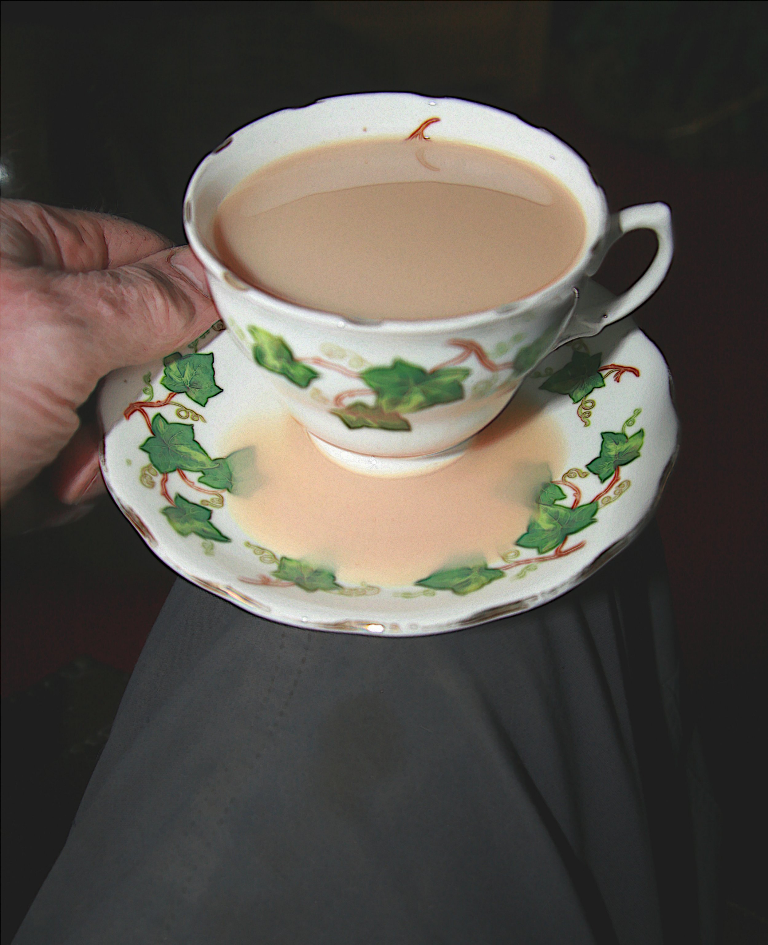 Frank shifted his position, forgetting the cup of tea on his knee. Some of it slopped into the saucer, and he had to make a grab for it to stop it, saucer and all, pitching to the floor. Mrs. Dodds came in at that moment, wearing the flour-stained green sailcloth apron that she reserved for baking.