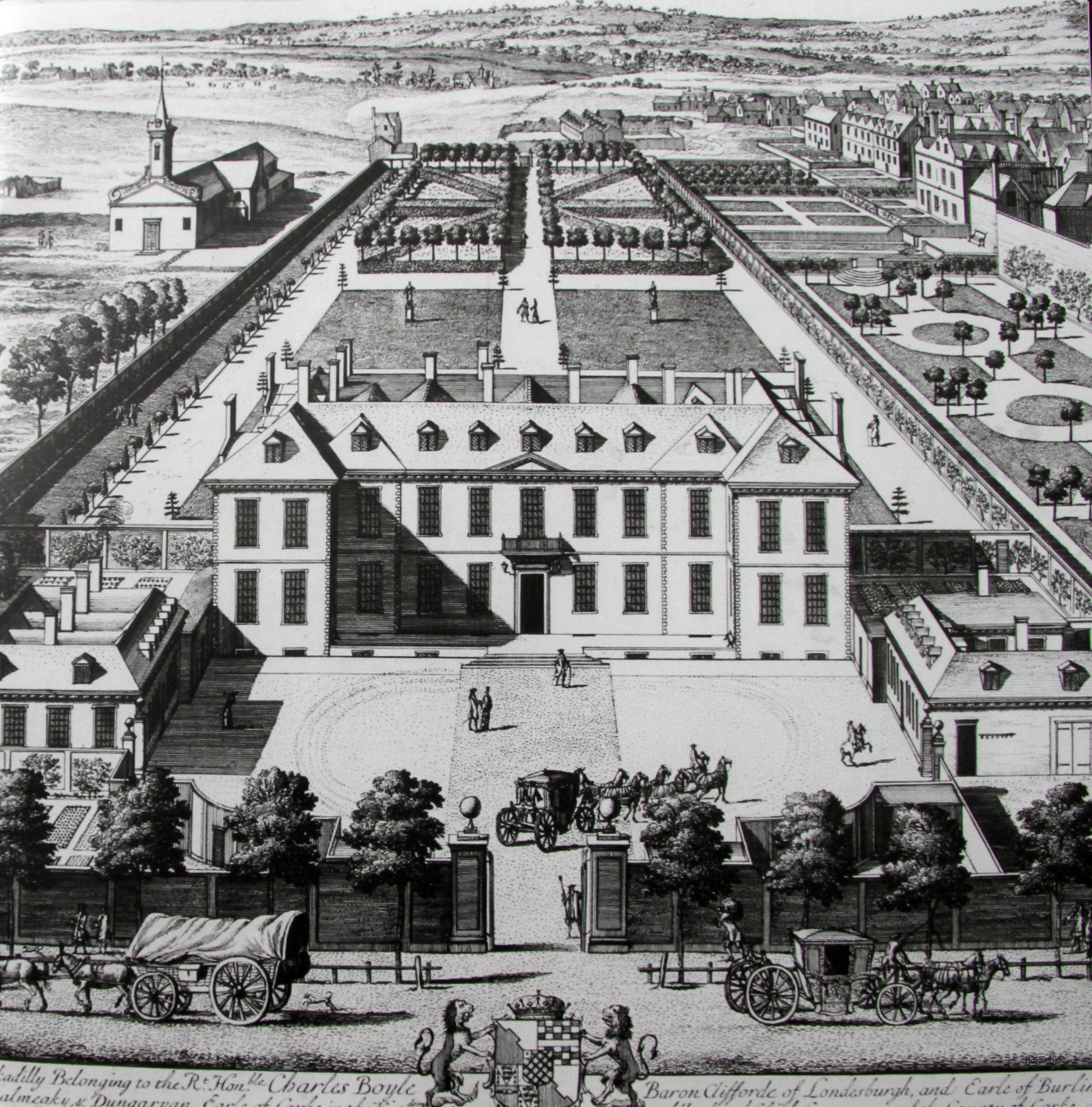 The original Burlington House was built by Sir John Denham, a wealthy lawyer and poet (he was also Surveyor General to the Crown) for his new bride, Margaret Brooke. She was eighteen and he was fifty (and apparently limped). Margaret very quickly became the mistress of James, Duke of York, who had attended their wedding (and was later to become King James II). Their affair was common knowledge, as certain salacious entries in Pepys’ diaries make clear.