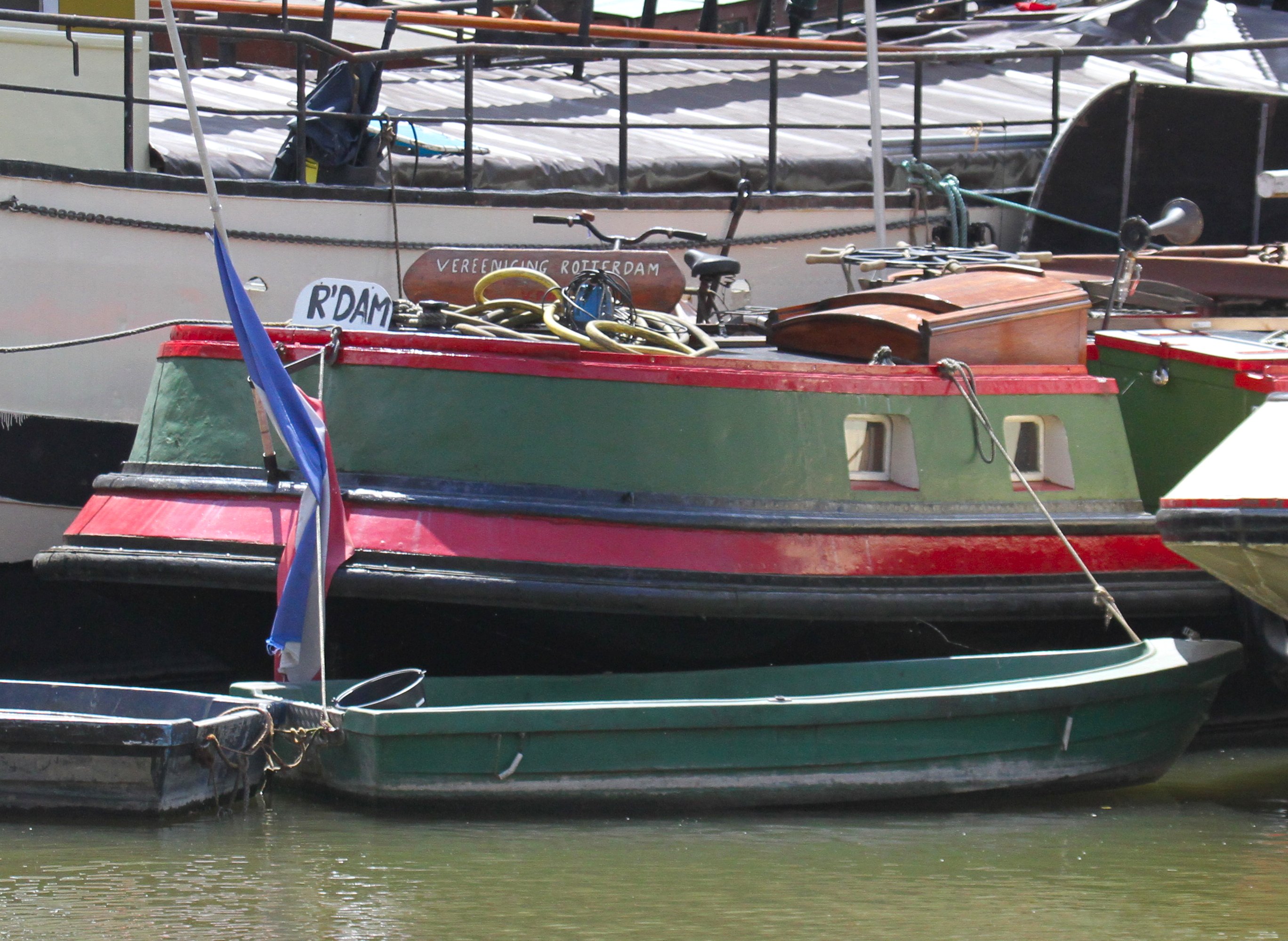 Vereeniging, just about the smallest of them all, nestled in her elegant green and red livery amongst the others… and I could see at a glance what had captured Valerie’s heart about her. She seemed so much more of a living presence, thanks to my reading of ‘Watery Ways’, and her character was buoyant and bubbly, with all the sprightliness and effervescence of a gig compared to the barouche landau sedateness of most of the other boats. I can’t wait to read the next instalment of her history, ‘Harbour Ways’, now in the making! An old bicycle stood to attention on the deck; theft of about eight others has made the owner chary of leaving a valuable machine on board.