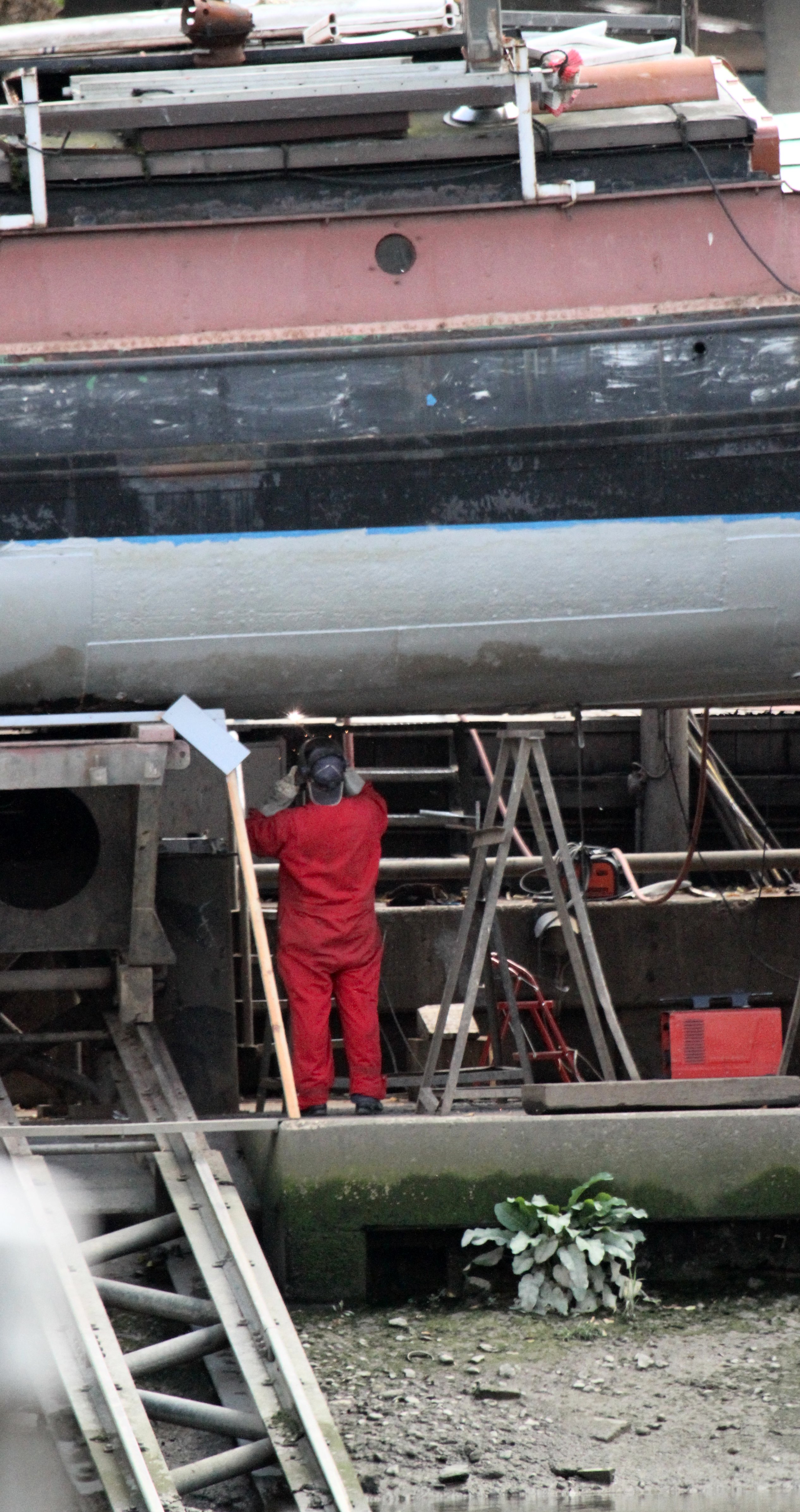 But we were here, as lovers of English canal boats and boating, to look at what was on the water (or, in the case of barge Luna, raised out of it to the dockside repair cradle and undergoing some heavy metal treatment – welding was well under way, if the boat wasn’t!). The barges are remarkable, with their sheer size, huge masts and characteristic leeboards (for they are sailing cargo vessels), and we should have loved to have been able to look inside them.