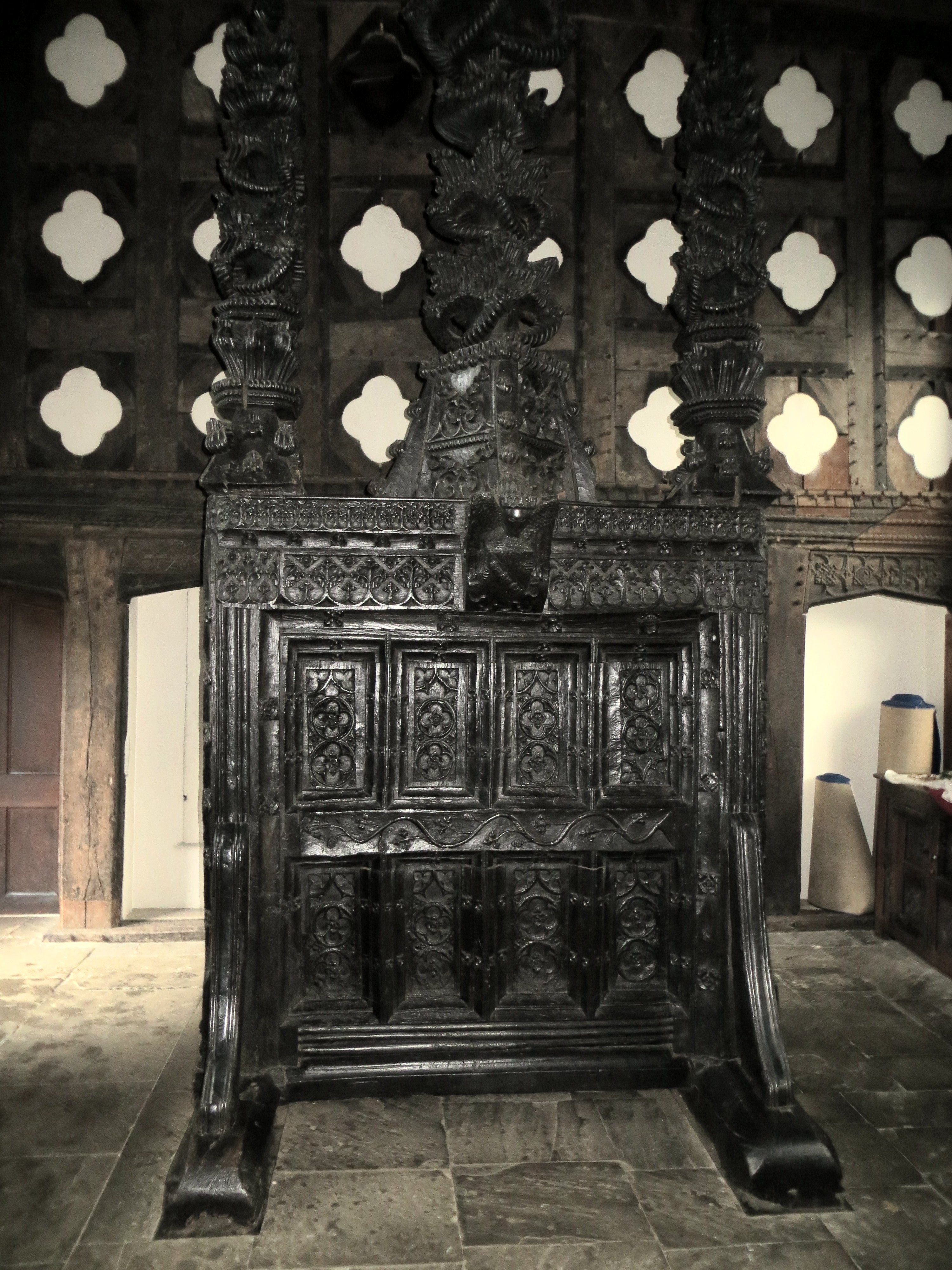 When we visited, the upstairs of the house (which is now owned by the National Trust) was being renovated and therefore out of bounds, but the downstairs, including the wonderful Great Hall (which is not too ‘great’ to be cosy when lit by an open fire) and various rooms of later dates, was open to the public. I was especially fascinated by the screen at the entrance to the Hall, the only survivor of its kind, which acted as a joint draught-excluder and obscurer of servants bearing away unsightly dirty dishes. It is a beautiful piece of carved oak, complete with quirks that say so much about the early Heskeths who commissioned it: for example, one of its panels is upside down and one of the angels it depicts has a supernumerary finger: A tribute to Anne Boleyn, also supposed to have had this ‘blemish’ (which was later produced as evidence that she was a witch)? Or, more probably, an observance of the mediaeval belief that no work of art should be perfect, lest it offend God? Also intriguing was the signature carved in the original Elizabethan glass of the bay window of the Hall, dated 1513 (so it was five centuries old this year). I’d love to have met its author!