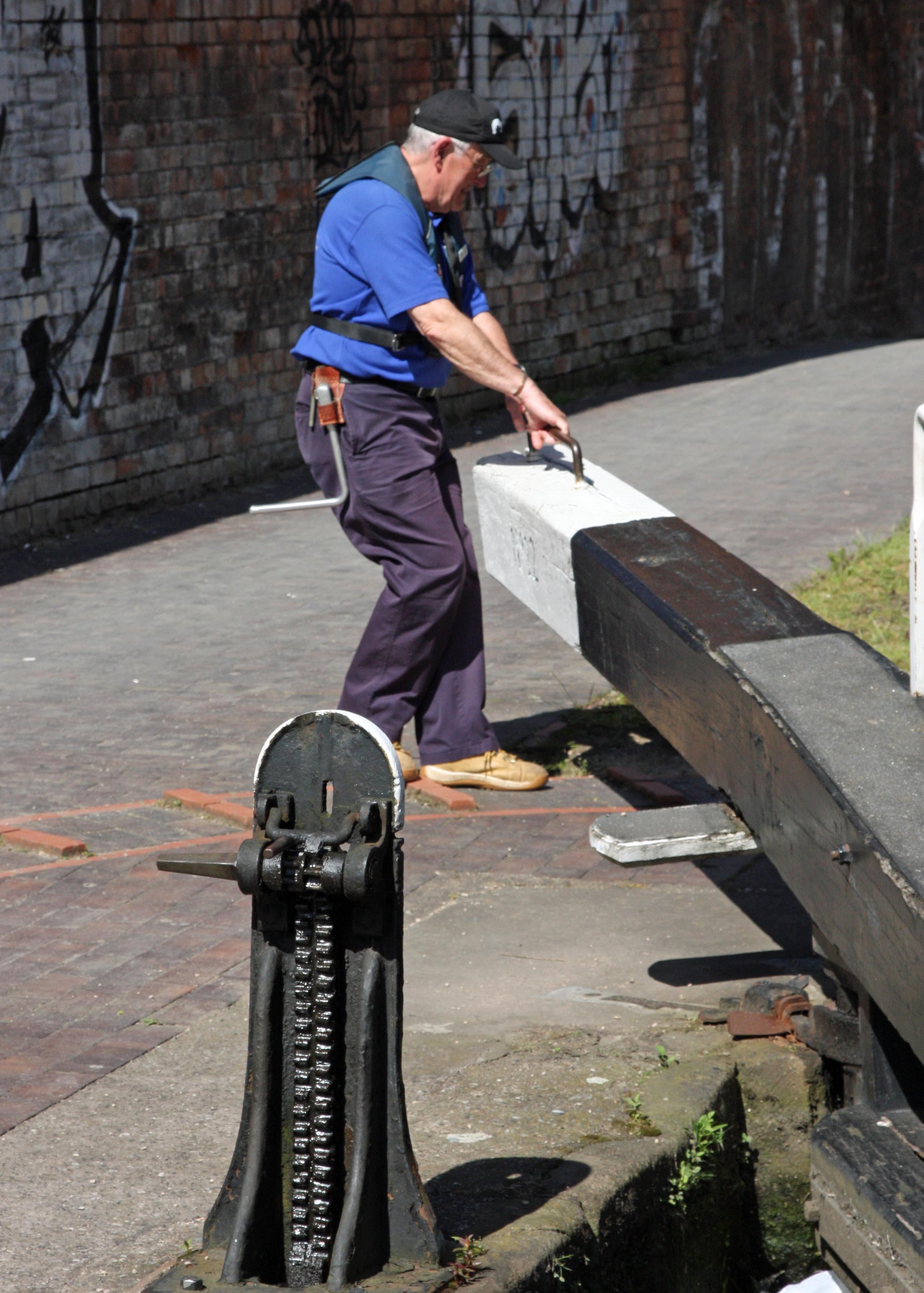 Their mood was volatile, so I thought it best to be discreet; as they passed me, I focused on trying to shift the paddles on my lock-gate, the ratchets of which were ancient and troublesome. As I was leaning my full weight on my windlass, I became aware of a man standing beside me. I looked up to see an athletic and well-preserved gentleman in his sixties. He offered to help. I saw that he was also carrying a windlass, and thought that he must have come from a boat further up.
