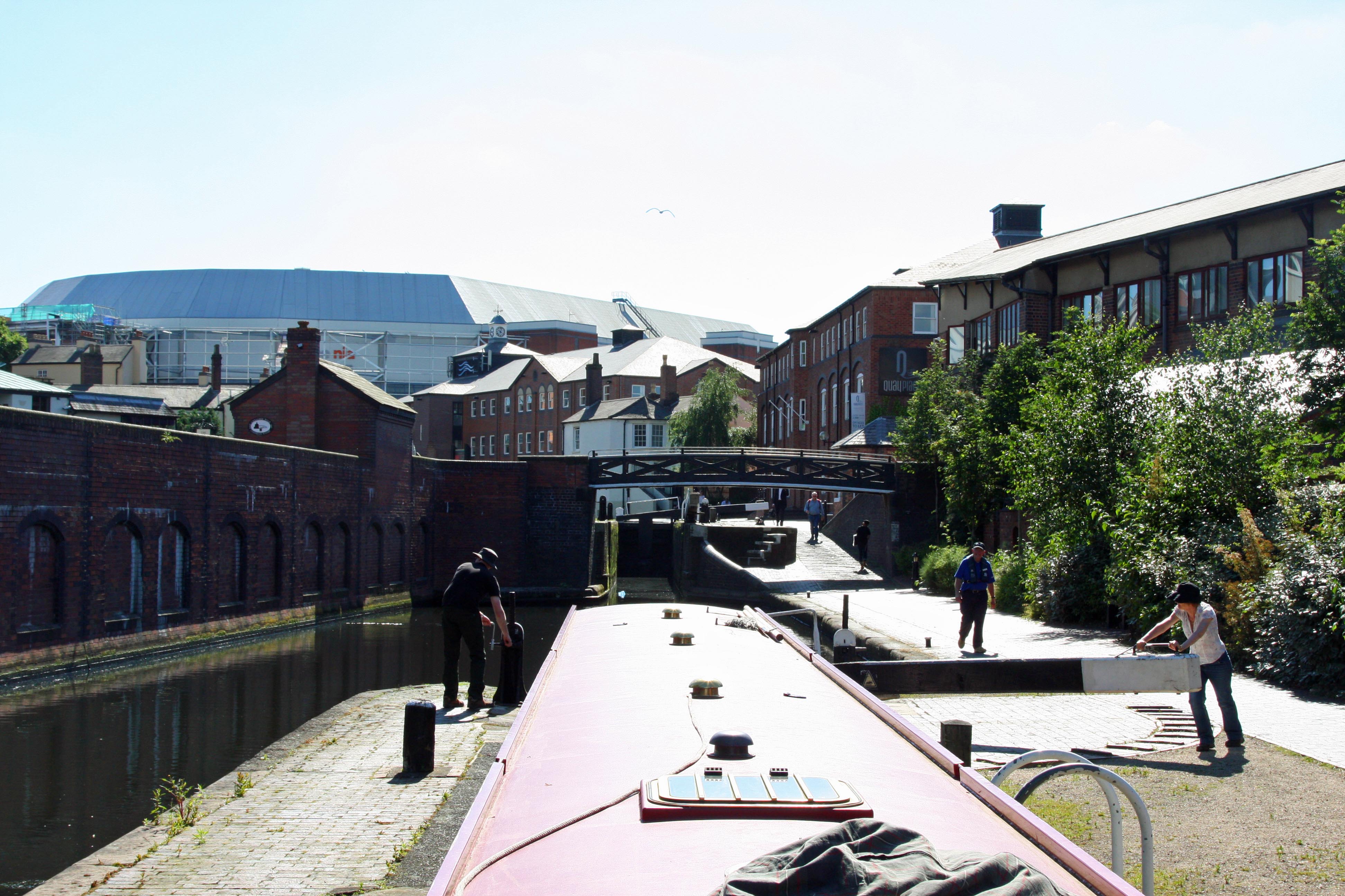 Michael returns from opening Lock 1, whilst I open lock 2. Rising above us, the National Indoor Arena.
