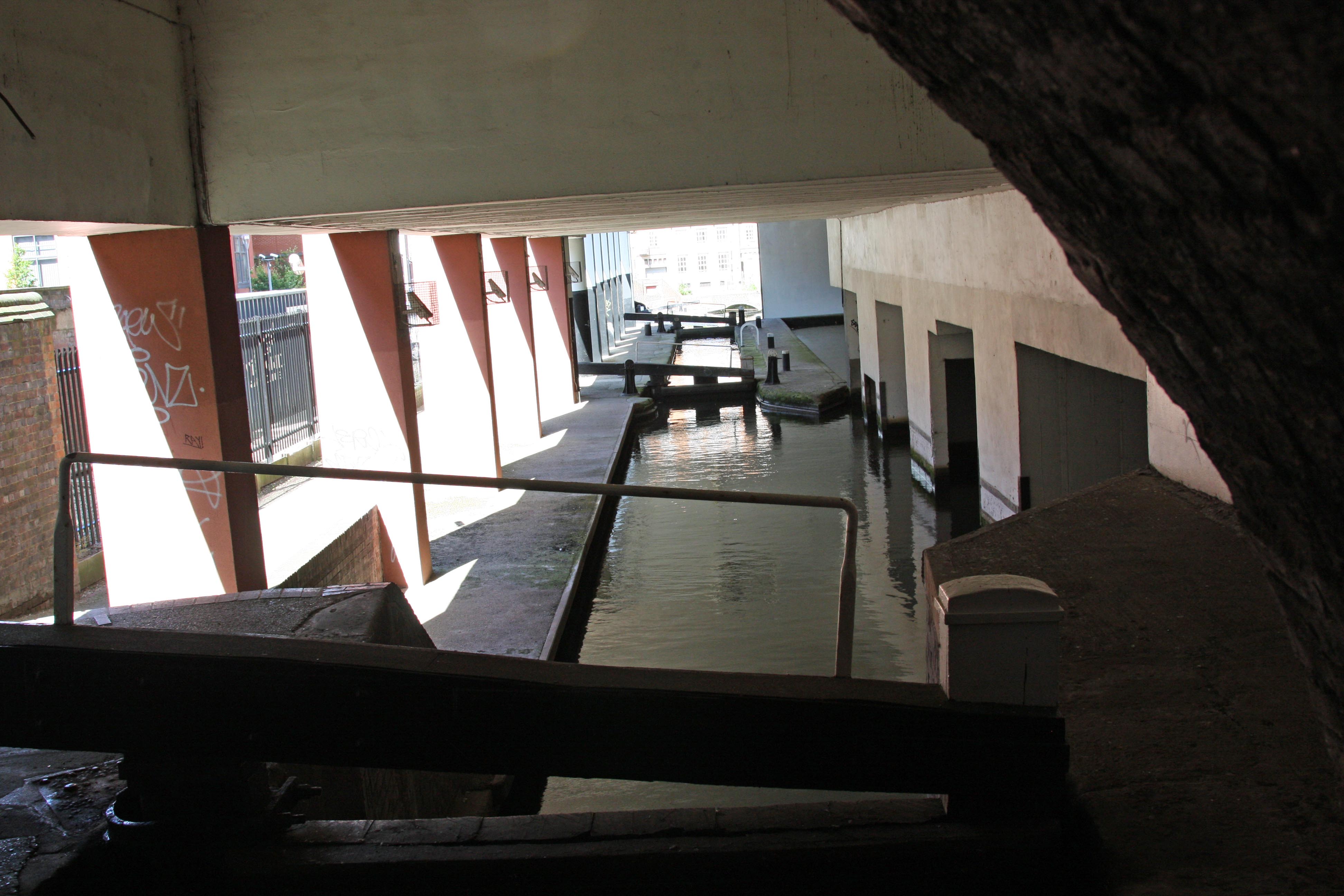 This lock flight, as I hope you can see from the photographs, is an astonishing blend of old and new, for it passes through (and under!) the commercial centre of Birmingham.