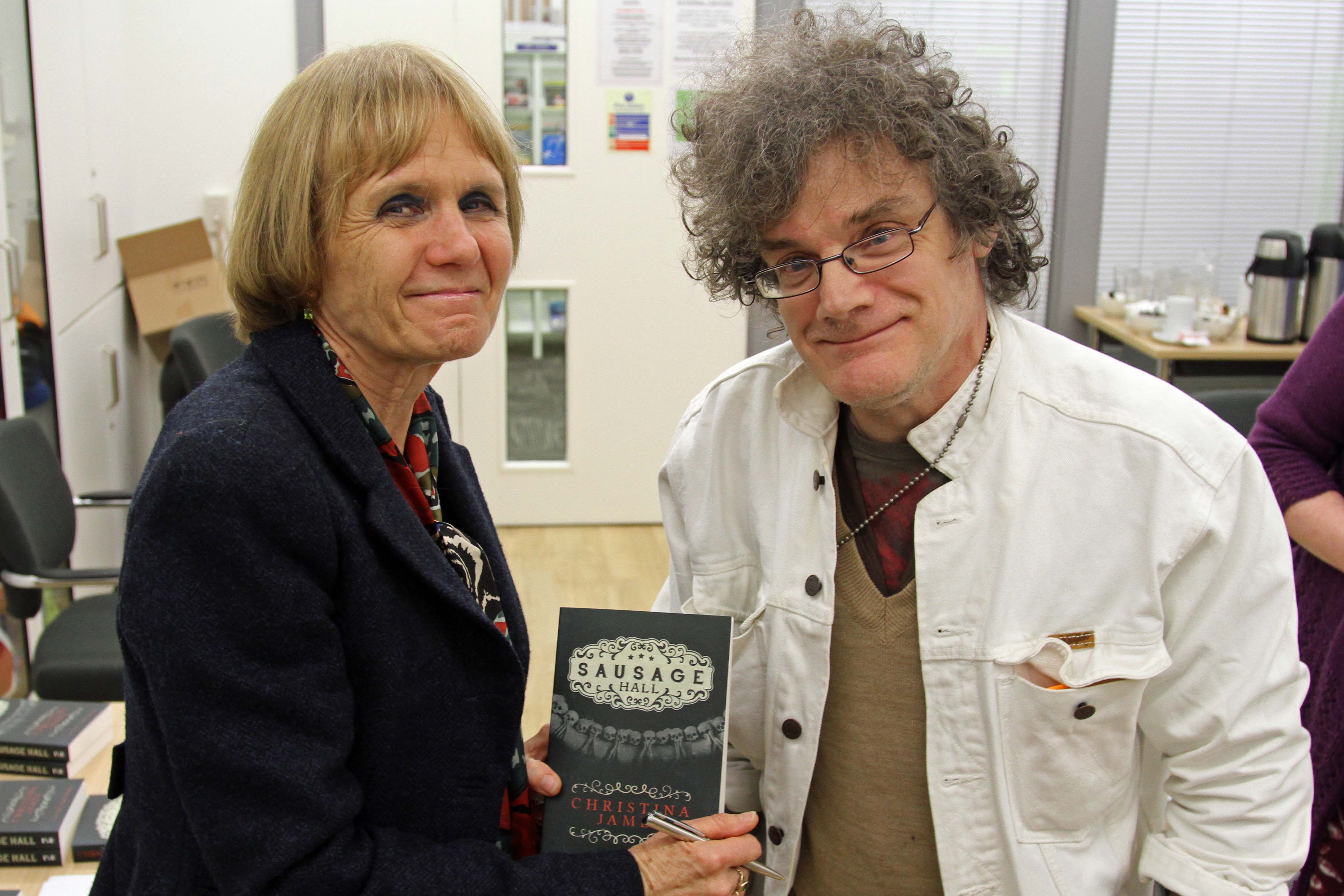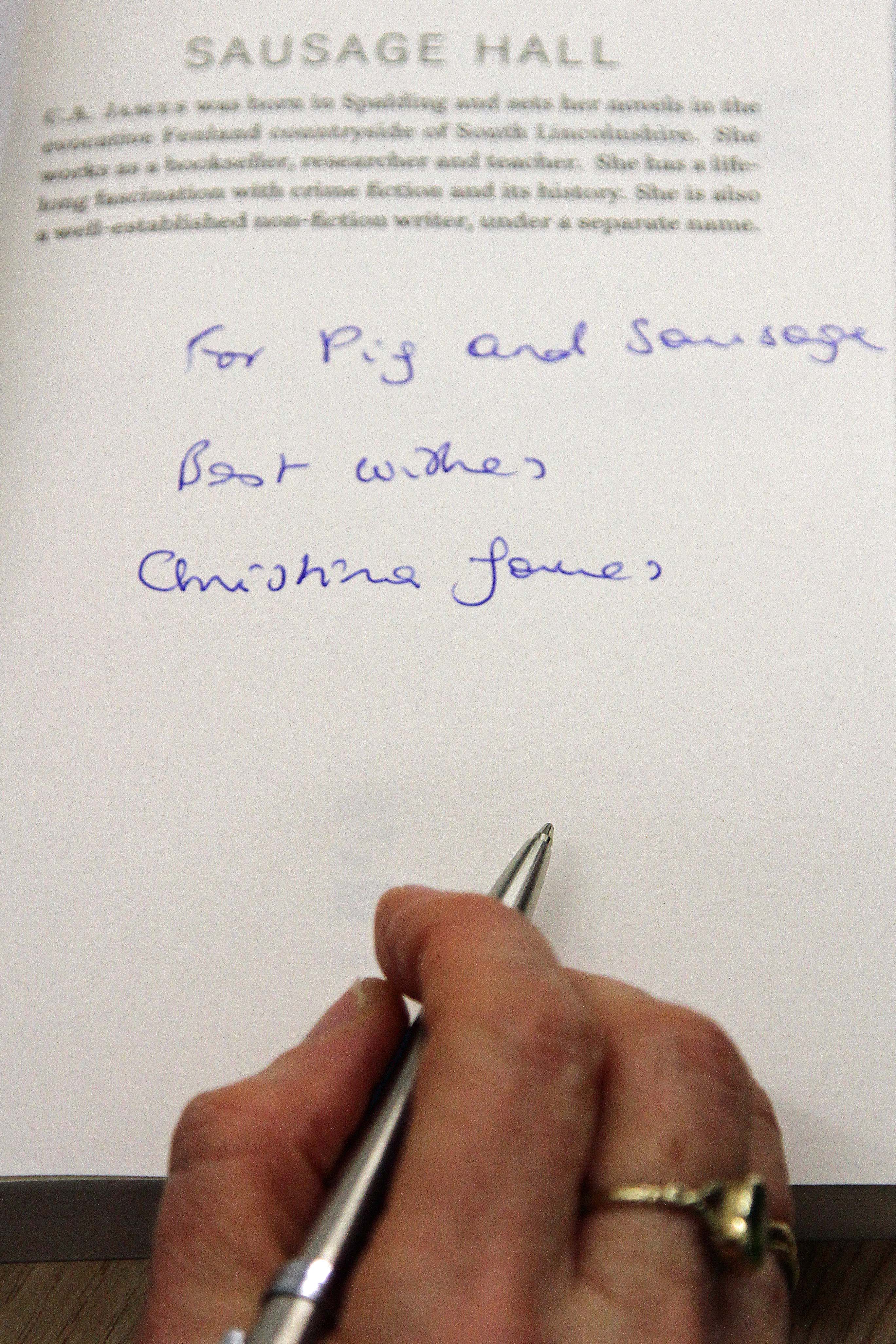 Several of the Wakefield readers had already bought Sausage Hall and came armed with it for me to sign. Others bought it during the tea-party; as at my other Wakefield events, the books were kindly supplied by Rickaro Books in Horbury. A man in the audience asked for an interesting, and very relevant, inscription (see caption): apparently, these are the nicknames of his brother and sister-in-law!