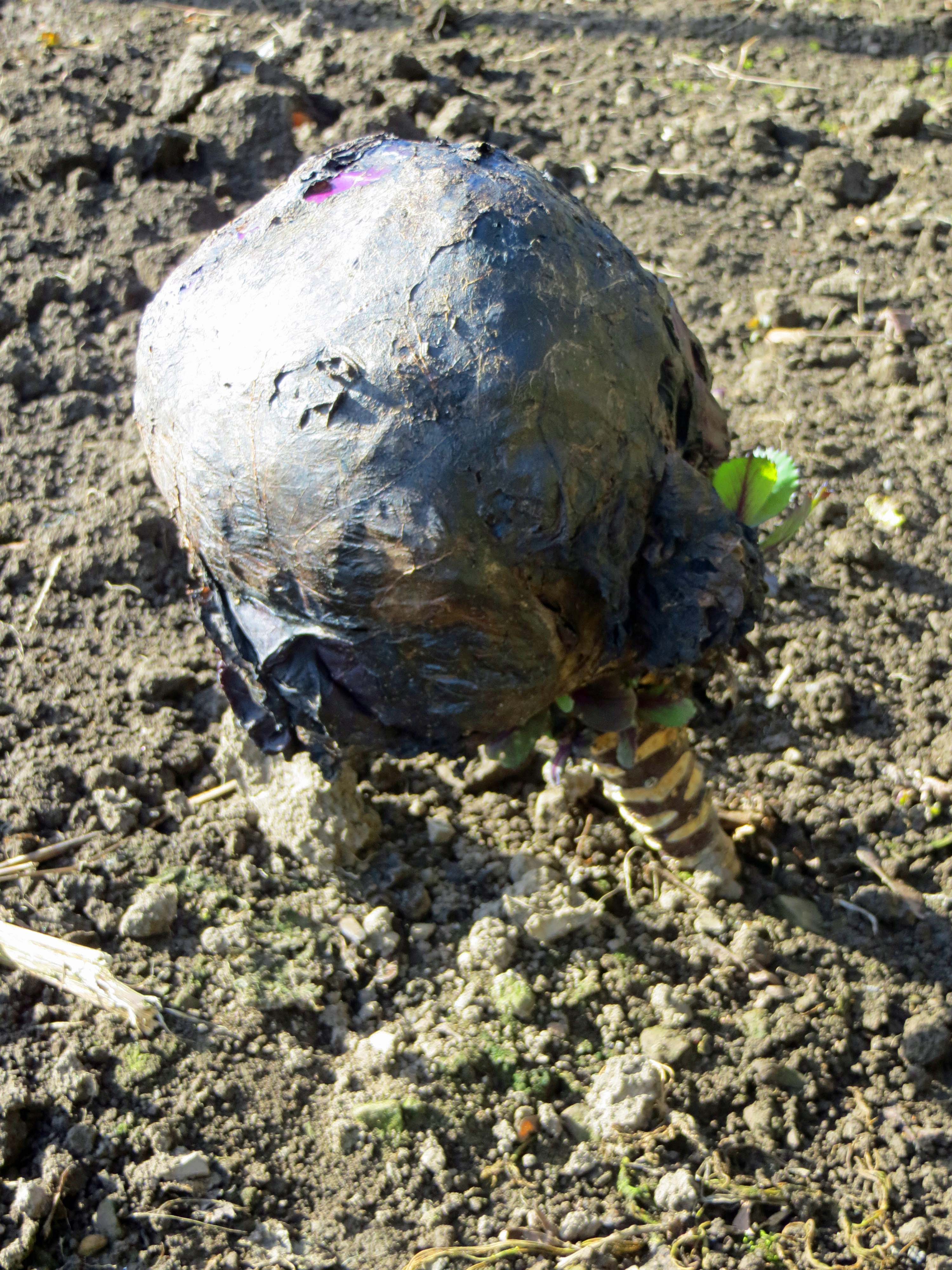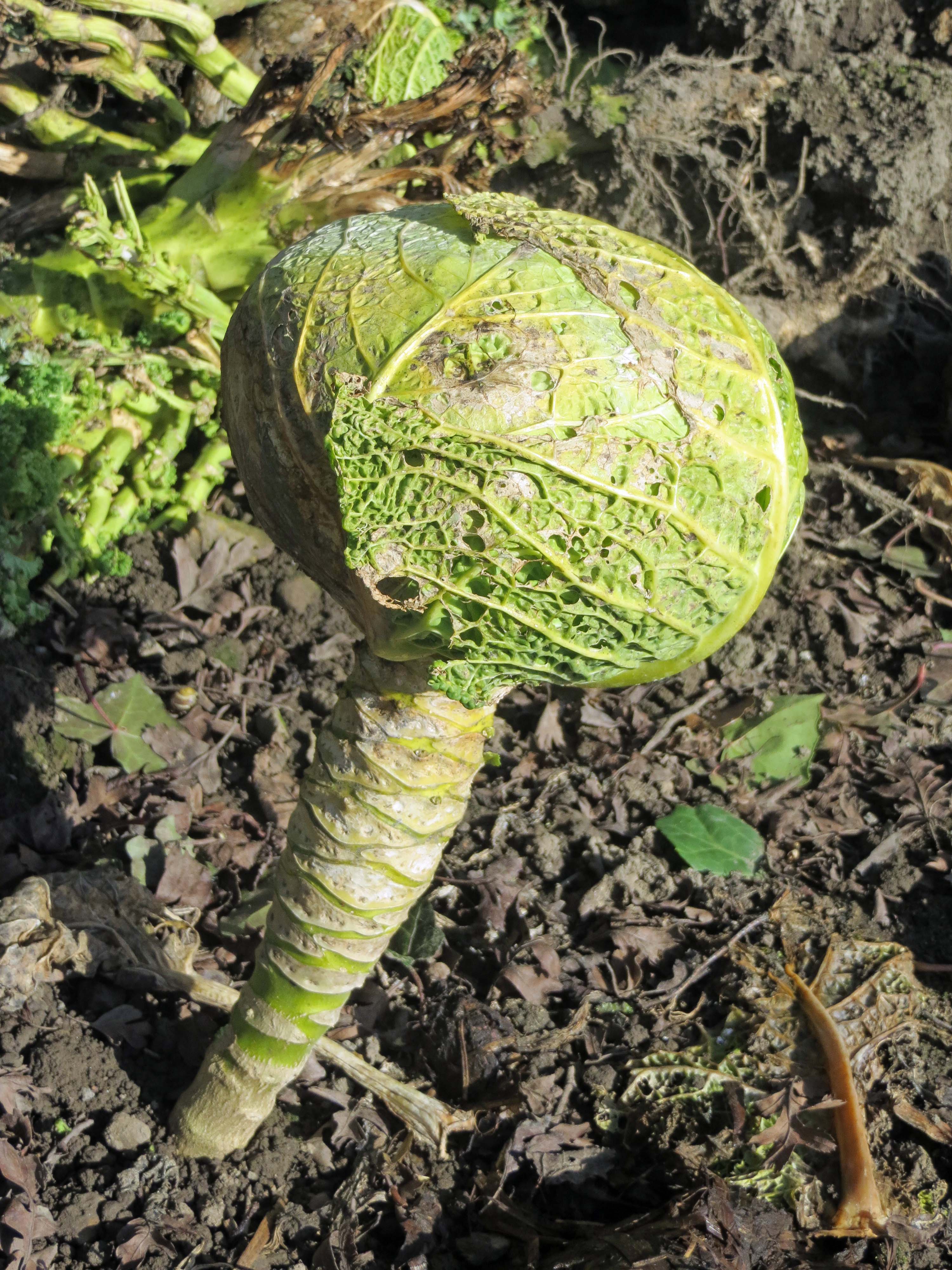 Partly because they were pretty difficult to reach amongst the debris of broken timbers and chicken wire, and partly because we’d had some over-supply, leftovers of last year’s crop remained, a brassica graveyard. Eight or so stalks of blackening Brussels sprouts tilted in a broken rank towards the boundary fence, a row of wounded soldiers at their last gasp. Several misshapen kohl rabi poked from the earth like a giantess’s bunions.