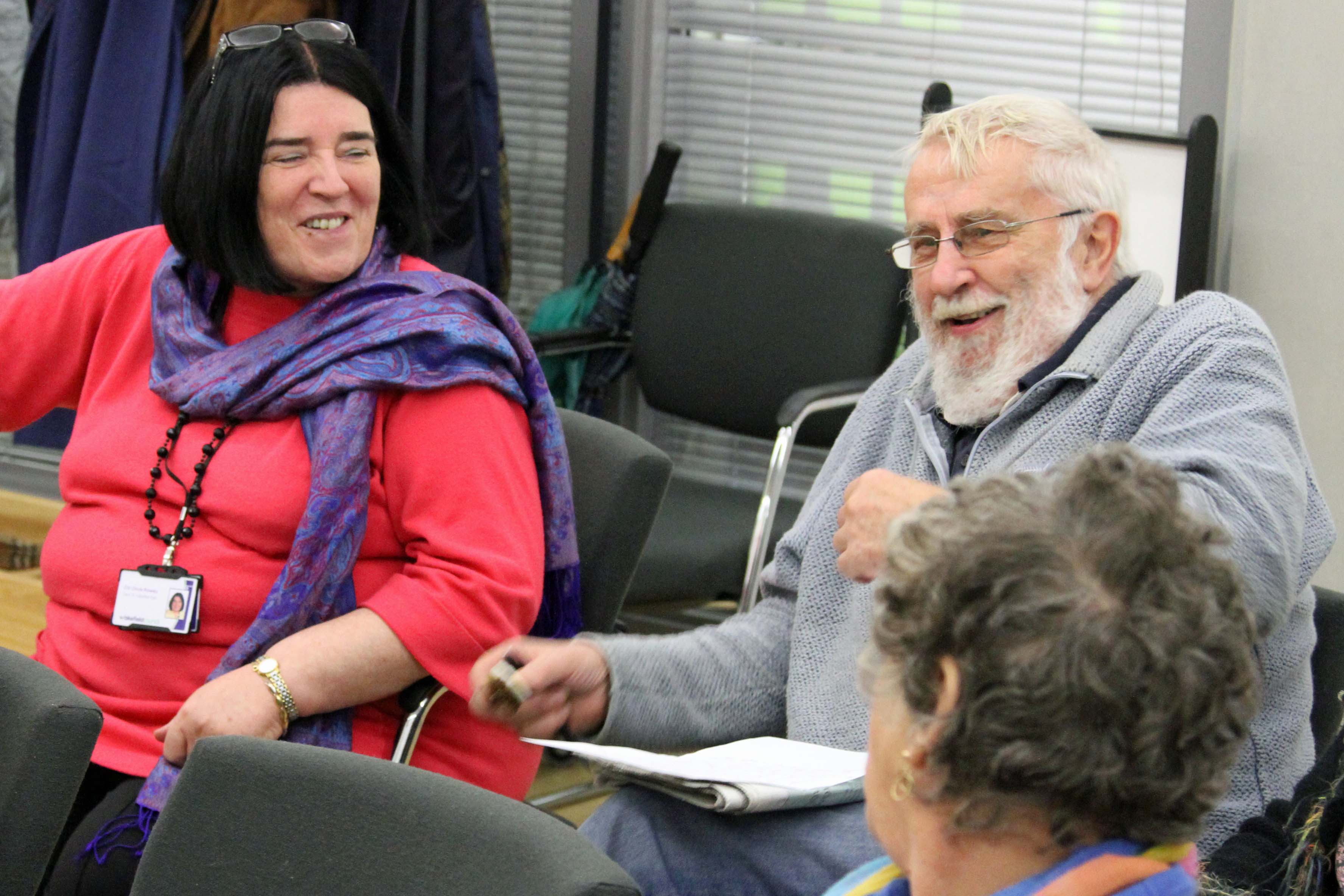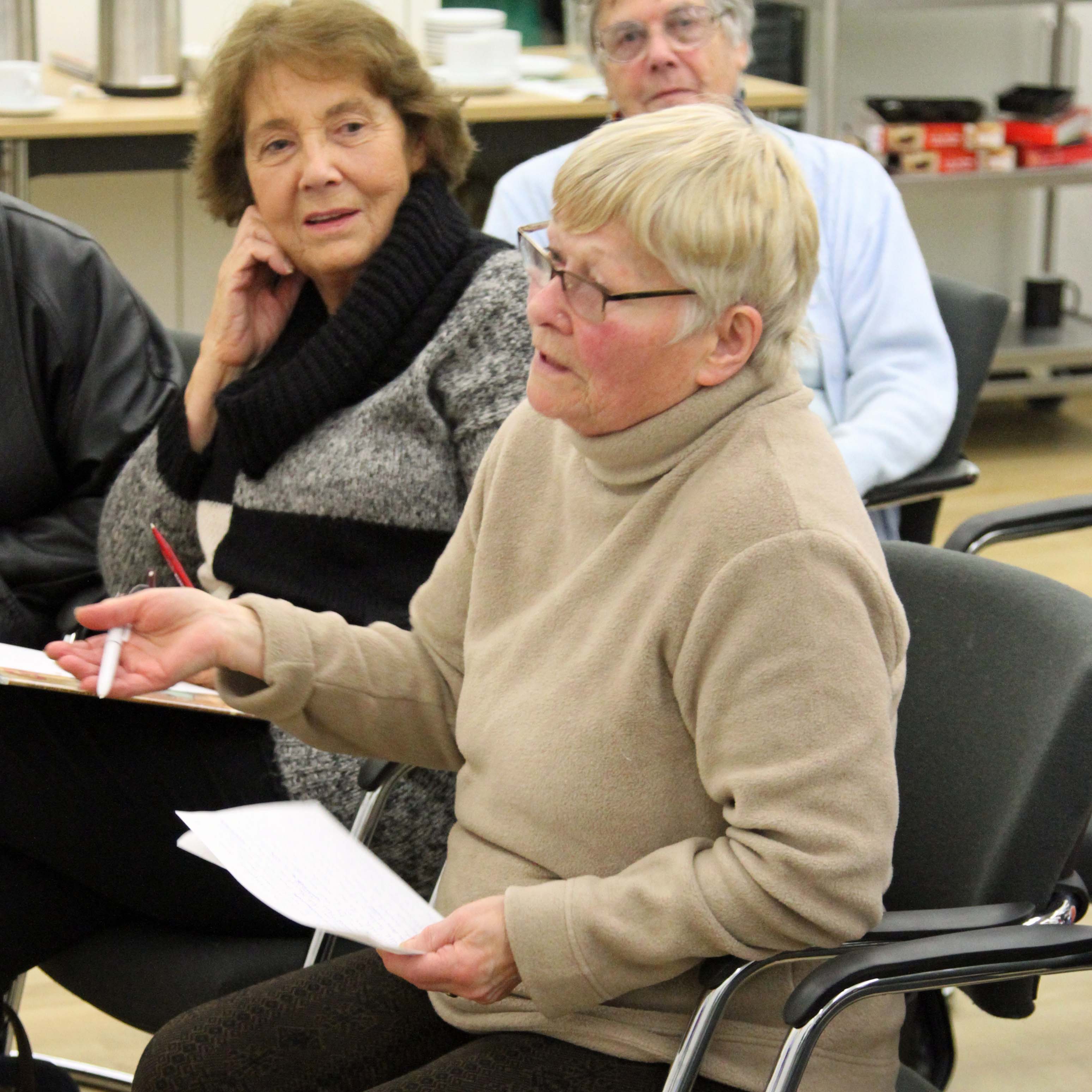 After listening to and providing feedback on the readings as only Wakefield audiences know how to do, when invited to take inspiration from the first chapter of The Crossing, each of the group members wrote a short sketch of an event that had happened to them and had stayed with them vividly, one that might be used as the opening scene of a novel. I hope the photographs capture the lively and committed participation that has come to be the hallmark of Wakefield One events: some read their own sketches, others asked their immediate neighbour to read for them. Everyone was spellbound by what was on offer. The accounts were fascinating and included bell-ringing for the first time and soaring unintentionally upwards on the rope, riding to London on The Flying Scotsman, walking to school through the snow in the Arctic winter of 1947 and the tale of how an uncle had pawned his wife’s hard-saved-for furniture to buy a red sports car. Novels in the making, every one – and the quality of the writing was of a very high standard.