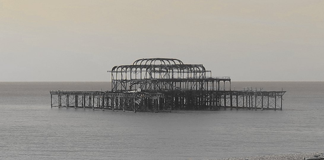 Anyway, by midday, although it was still very cold, the snow had melted and I ventured out from The Old Ship to meet my former English teacher for lunch (more about this on another occasion). Before the conference started, I also managed to take a walk along the promenade and was saddened to see the hideous buckled corpse of the West Pier, still rising up out of the sea like a squashed daddy longlegs. The structure has suffered terminal damage since my last visit.