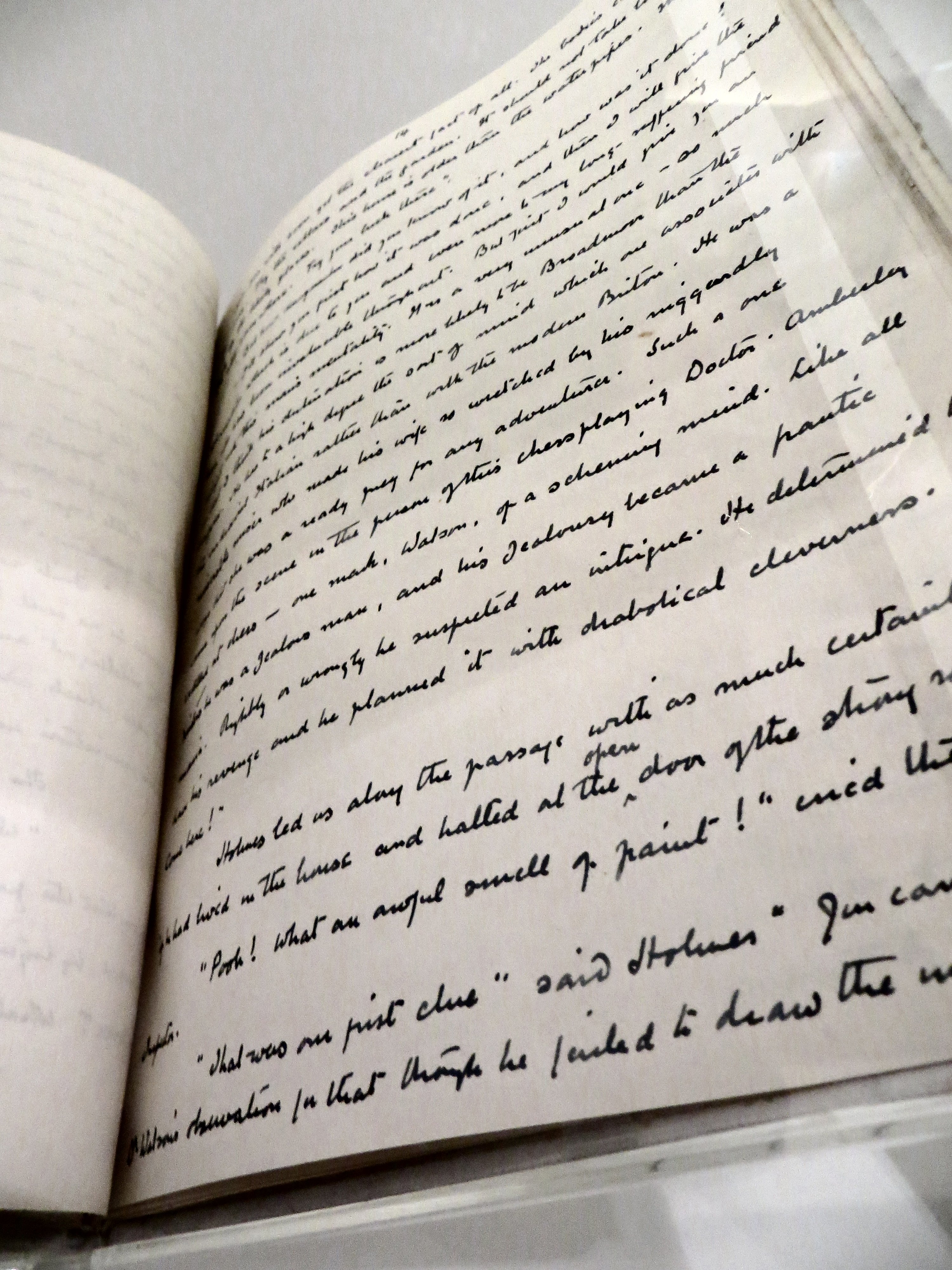 It is an inspired way of celebrating the genre. My favourite letters included ‘L’ for lady crime writers – I had not realised that until P.D. James published her debut crime novel, Cover her Face, in 1962, the fictional lady sleuth had pretty much dropped out of sight since Victorian times – and, of course, ‘B’ for Baker Street. The Holmes showcase included some specimens of Conan Doyle’s manuscripts (which I photographed before I was told to put away my camera by a security guard – I honestly had not realised that photography was not allowed!). I revisited many crime-related topics that I’ve researched myself, often presented in ways that made me regard them anew, and discovered some fascinating facts; for example, that Wilkie Collins’ estimated annual income from The Woman in White (published in 1860) was £60,000 p.a.