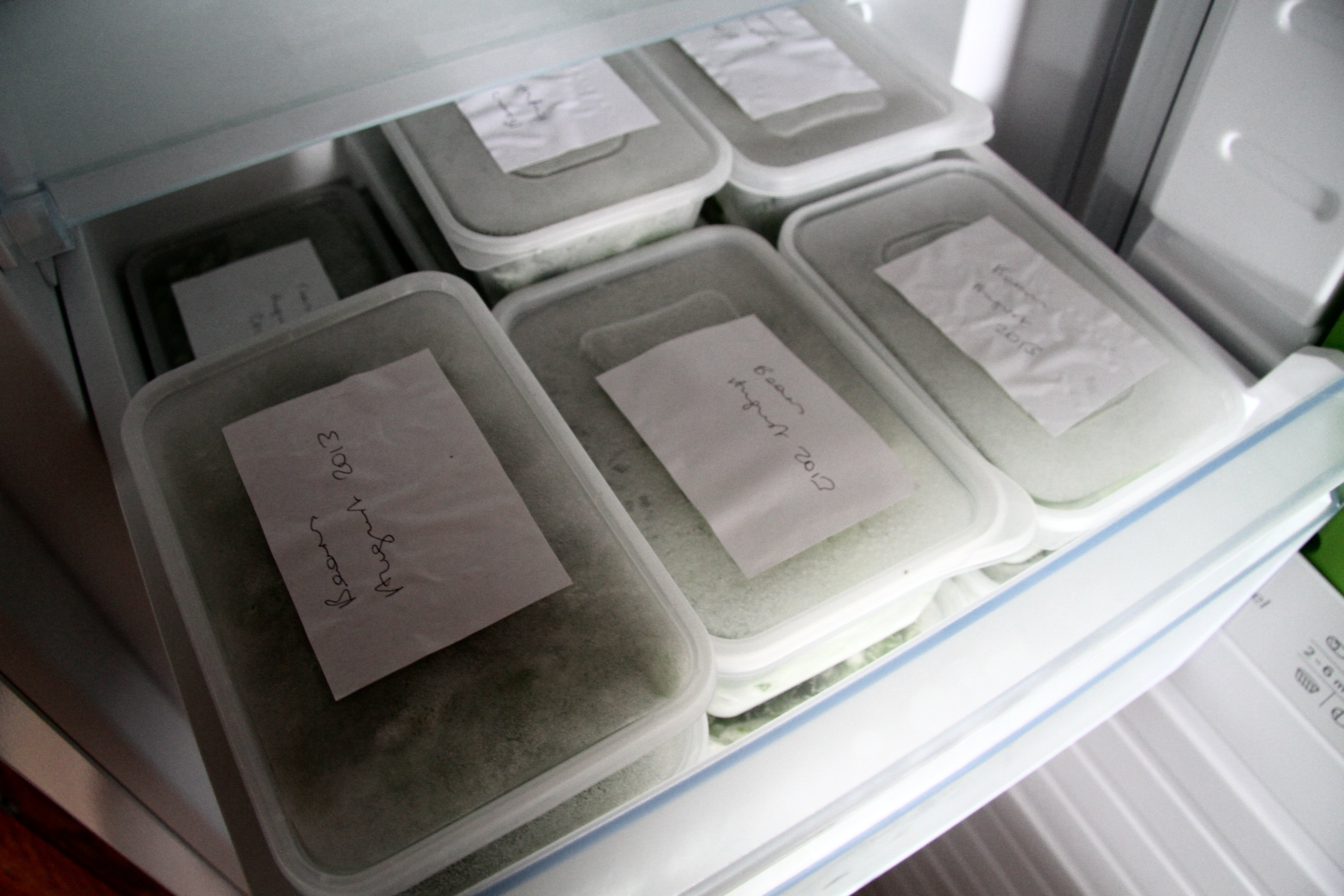 - DO label the boxes with the date and note of the contents – though there is no need to go overboard. Mine say ‘Peas, July 2013’ or ‘Beans, August 2013’. It is a mistake to convert labelling into an art form: “White Lady, sliced. Harvested 6th August at 06.00 on a dewy morning, sun just peeping through. Blanched and chilled between 10.10 and 10.20 hours. Put to freeze at 10.30 hours. Twelve ounces: serves four.” Apart from the time that it takes, it will turn you into a freezer nerd. And no, I don’t harvest beans at 06.00.