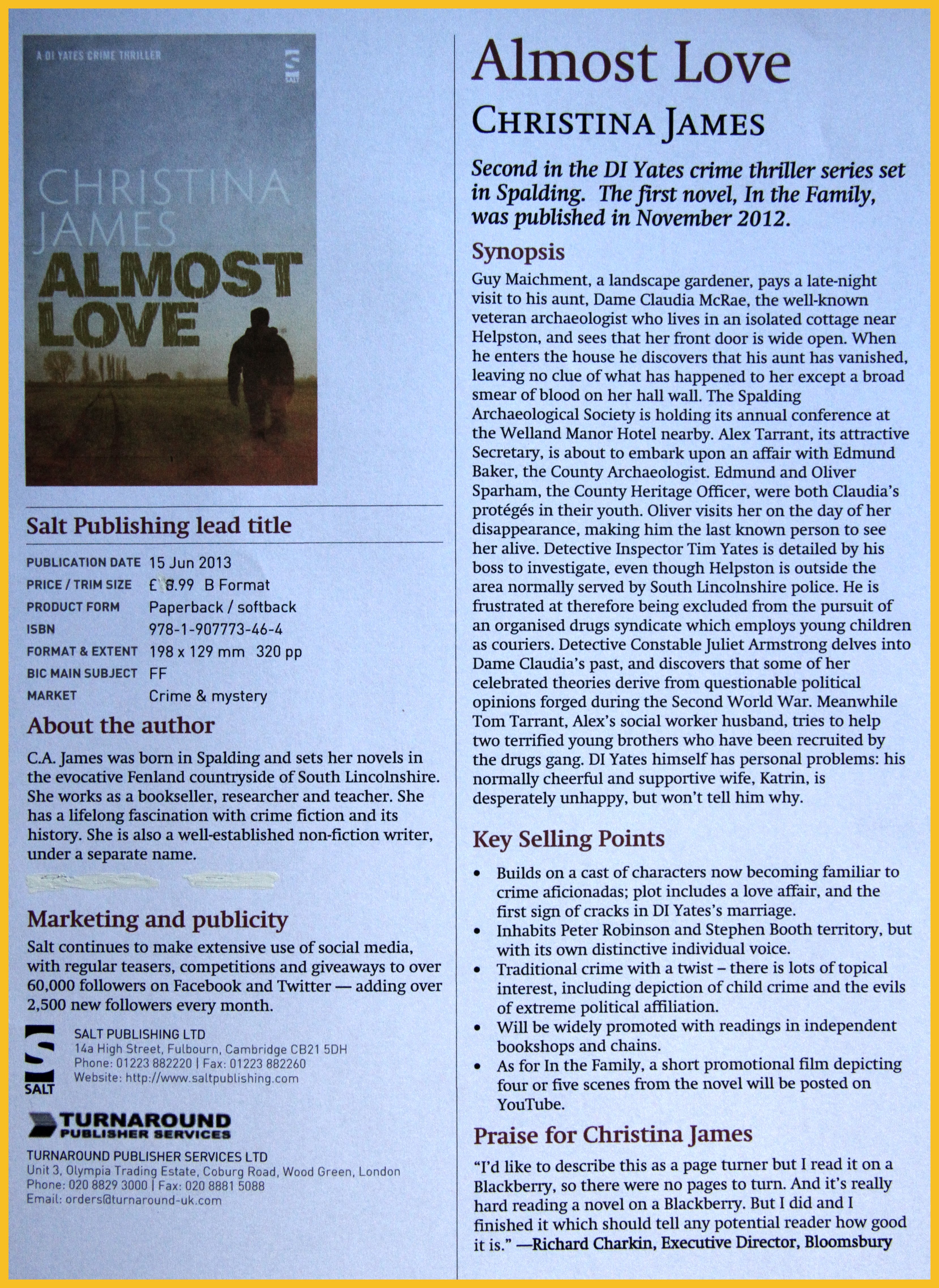 So here I am, one month away from the publication day for Almost Love, which has reached the proof stage. I have marked the day by putting the ‘milestone’ countdown widget here (as if I needed it!), because that seems a celebratory thing to do, as well as adding the clickable cover picture and link to an interview about Almost Love, both of which are to your right on the sidebar. It’s enormously exciting, and humbling, for me to be able to visit the Salt Publishing home page and to see my second novel there, whirling on the carousel amongst those other glorious titles, including Alison Moore’s latest (The Pre-War House and Other Stories, launching tonight at Waterstones Nottingham), David Gaffney’s More Sawn-Off Tales and Alice Thompson’s new novel, Burnt Island, not forgetting my fellow crimewriter Matthew Pritchard’s Scarecrow (to be published in the autumn).